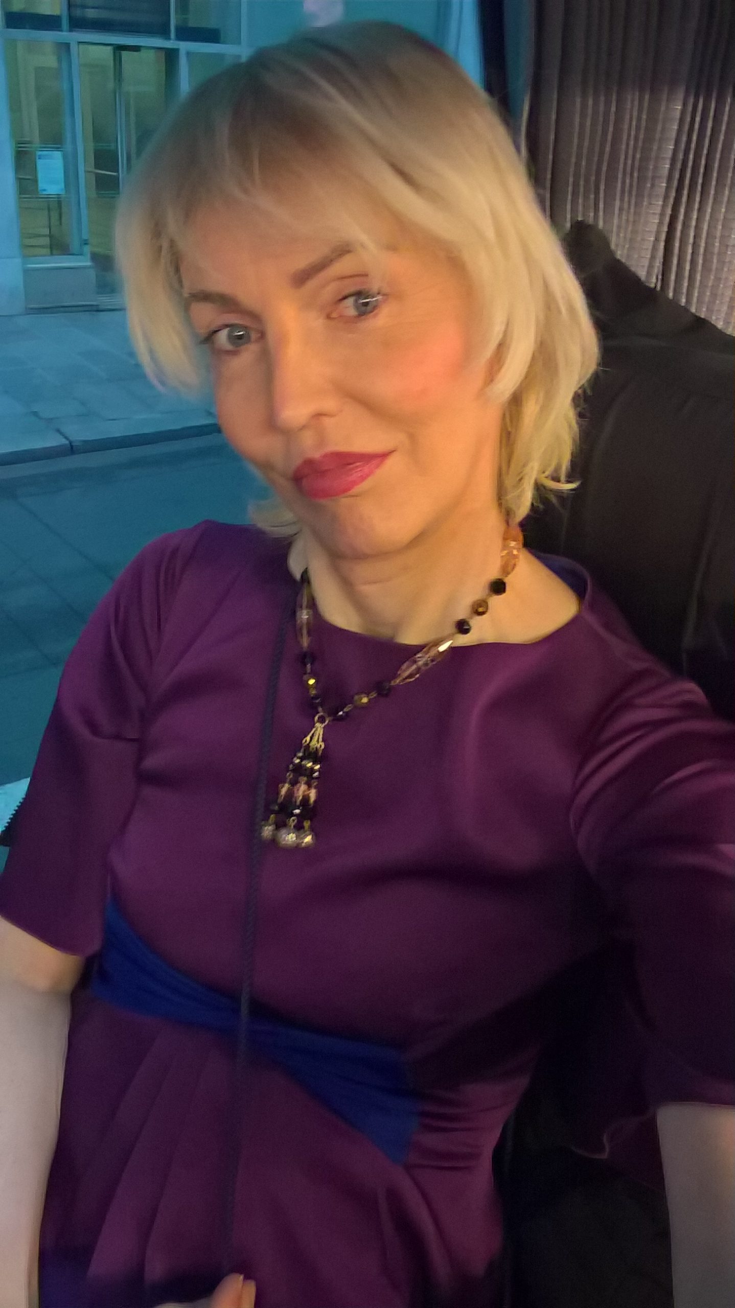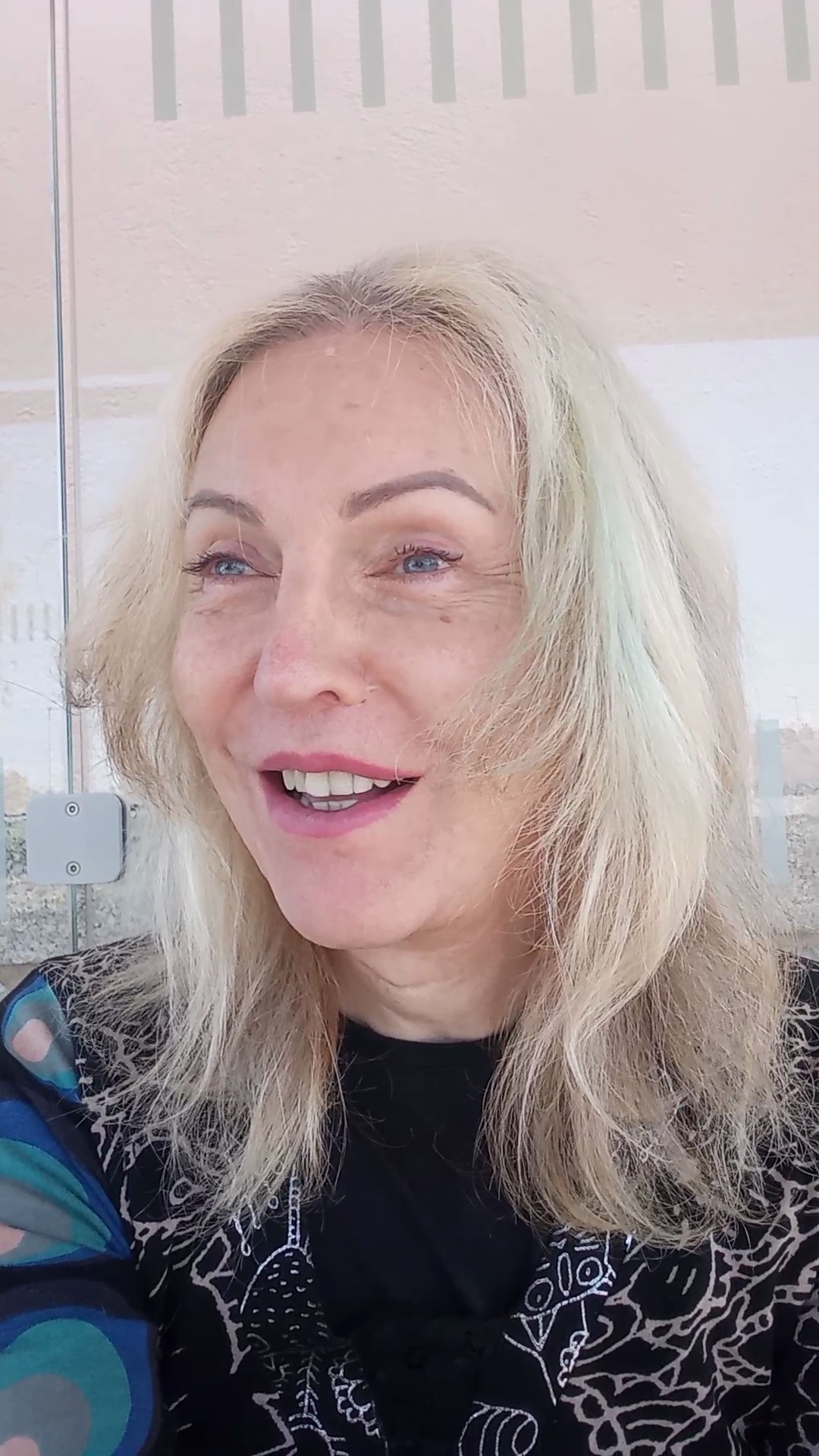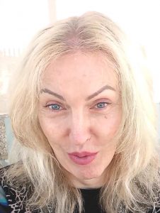 Blonde décolorée, yeux bleus.